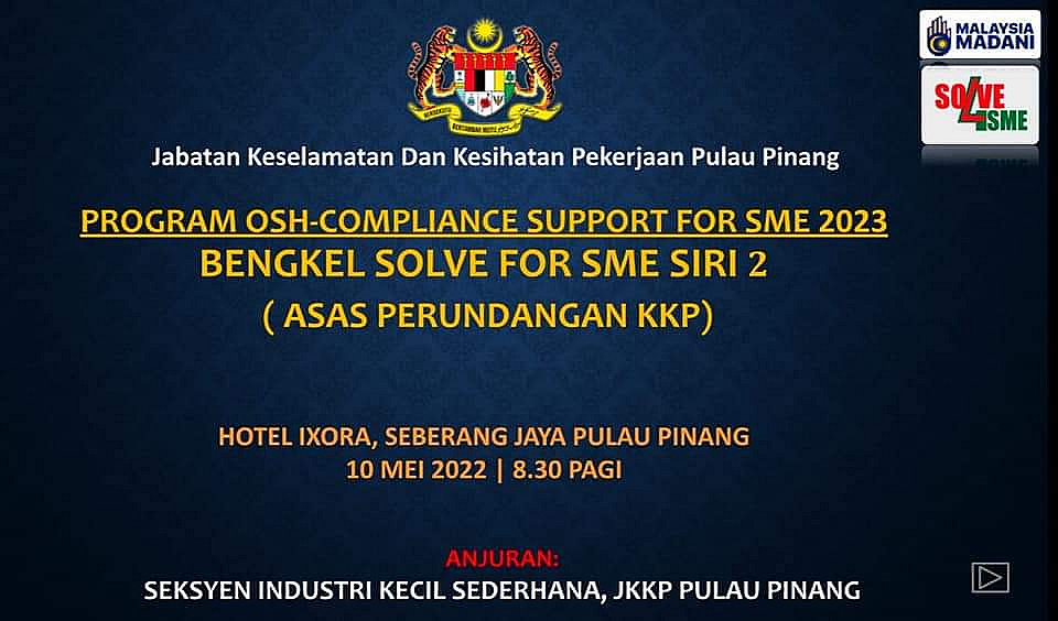 Program OSH-Compliance Support For SME 2023, Bengkel SOLVE for SME Siri 2( Asas Perundangan KKP) telah diadakan pada 10 Mei 2023 di Hotel Ixora, Seberang Jaya, Pulau Pinang.