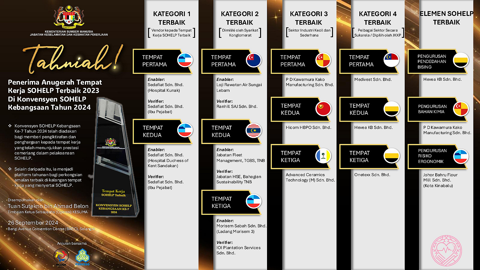 Konvensyen ini diadakan bagi memberi pengiktirafan dan penghargaan kepada tempat kerja yang telah menunjukkan prestasi cemerlang dalam pelaksanaan SOHELP selain menjadi platform tahunan bagi perkongsian amalan terbaik di tempat kerja khusus bagi elemen pengurusan pendedahan bising, bahan kimia dan ergonomik. Sebanyak 19 Anugerah Tempat Kerja SOHELP Terbaik mengikut kategori dan elemen telah disampaikan kepada tempat kerja yang berjaya.