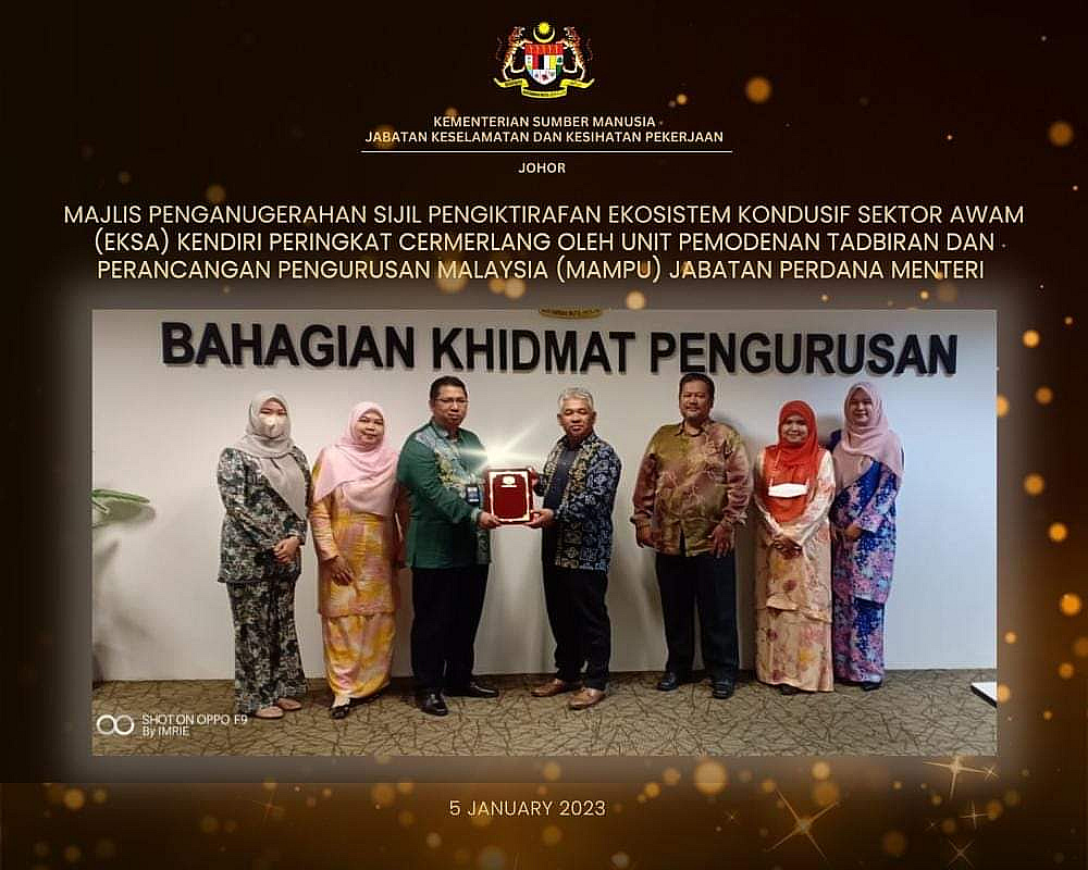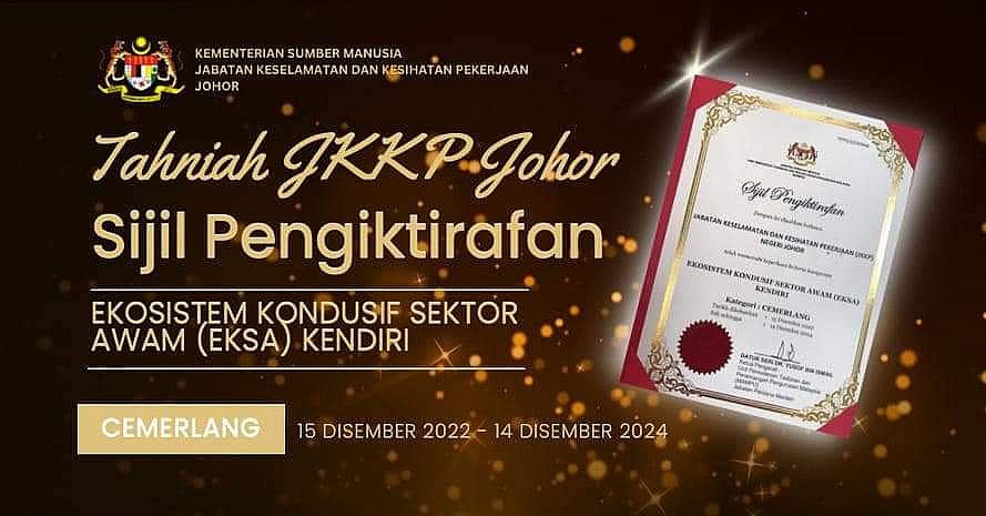 JKKP Johor telah dianugerahkan sijil pengiktirafan Ekosistem Kondusif Sektor Awam (EKSA) kendiri peringkat CEMERLANG oleh Unit Pemodenan Tadbiran Dan Perancangan Pengurusan Malaysia (MAMPU), Jabatan Perdana Menteri.